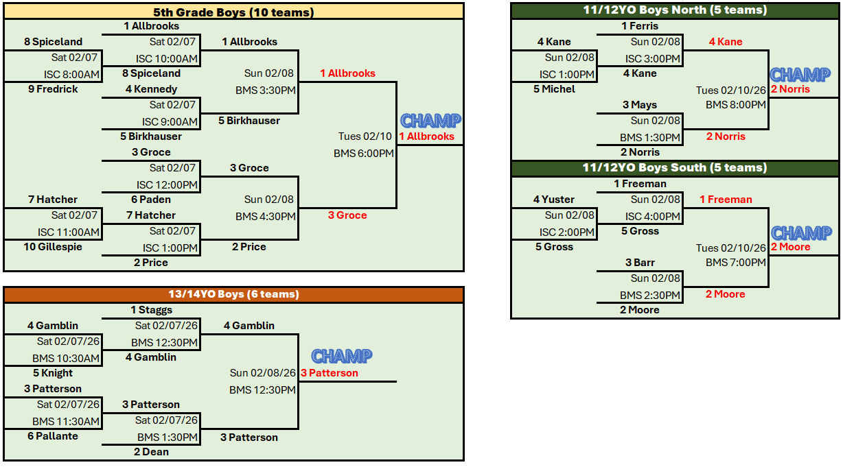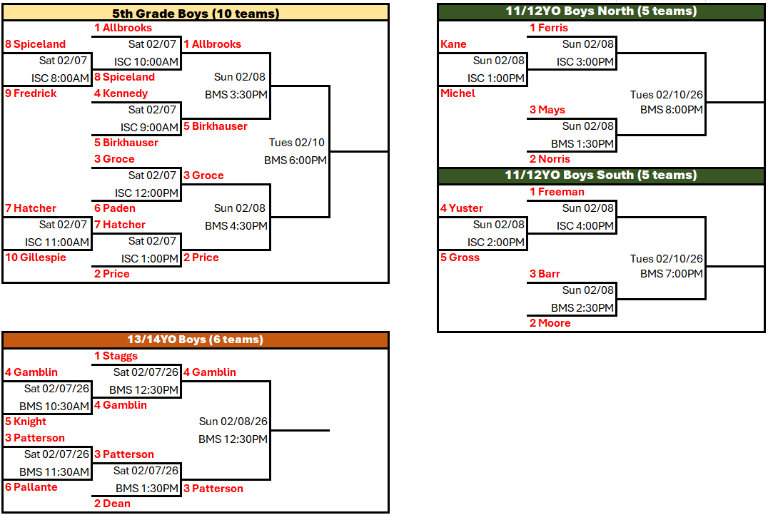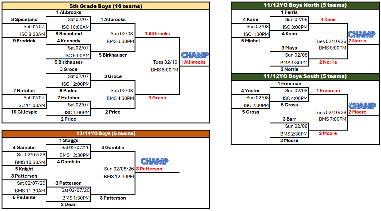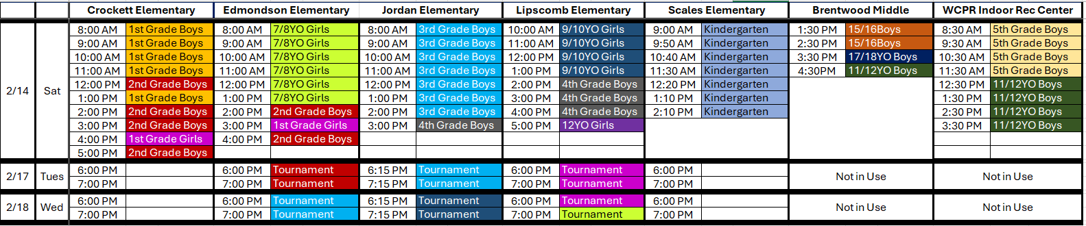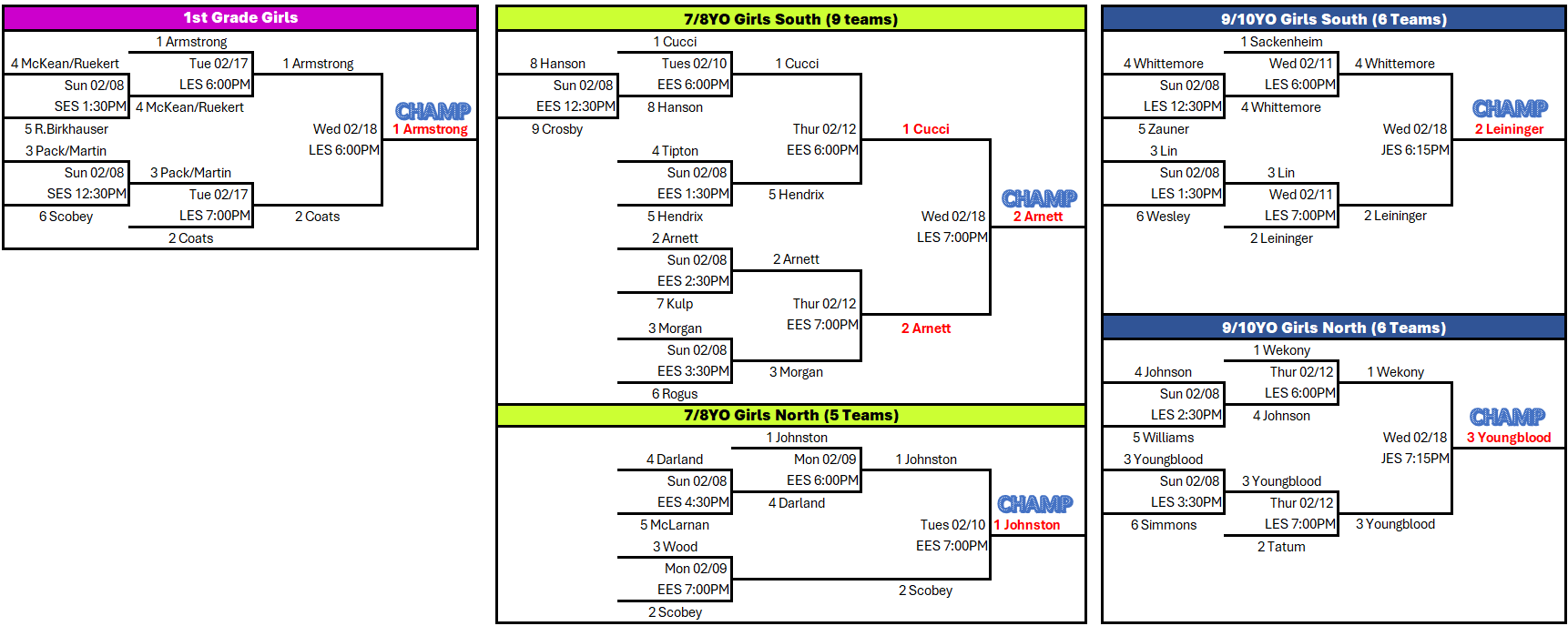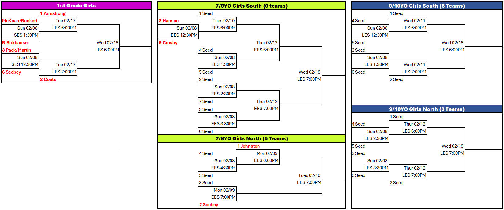This email is intended for all 1st grade Boys & Girls, 2nd grade Boys, 3rd grade Boys, 4th grade Boys, 5th grade Boys, 11/12YO Boys, 13/14YO Boys, 7/8YO Girls, 9/10YO Girls. These divisions represent the teams that will participat...