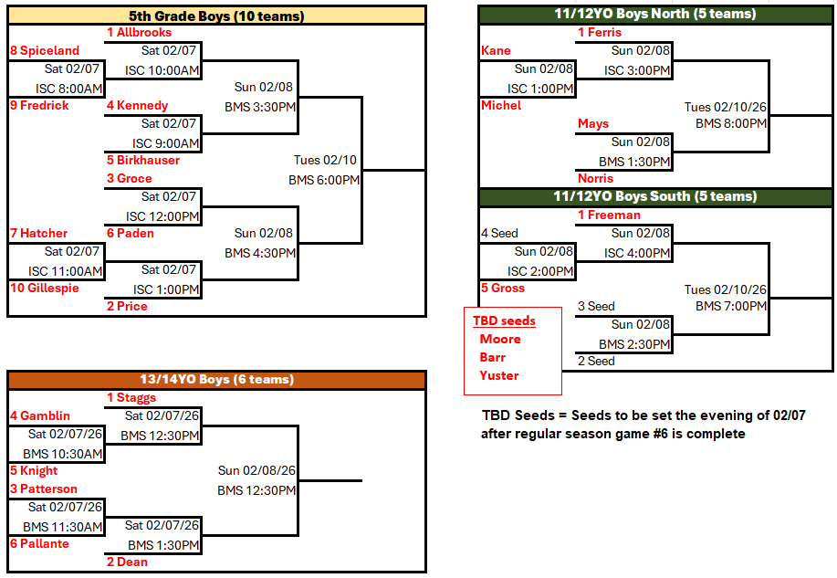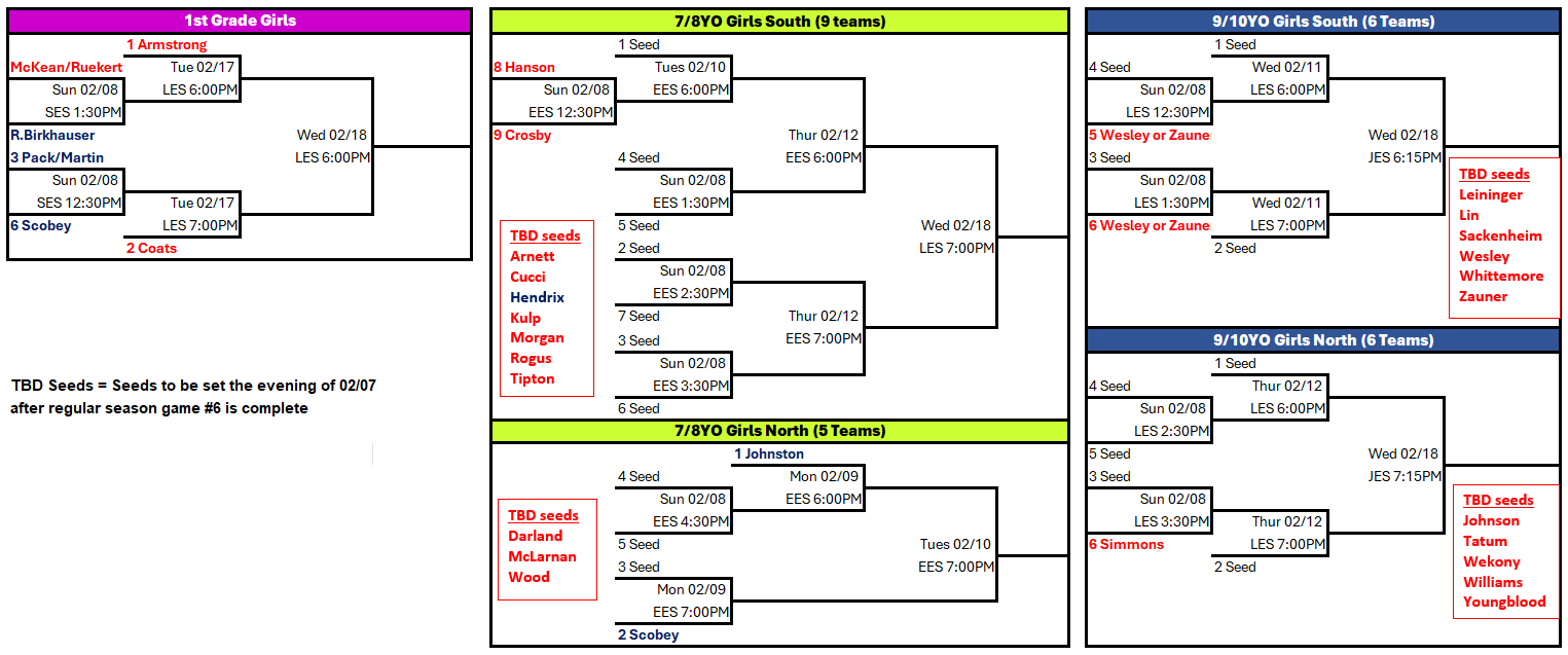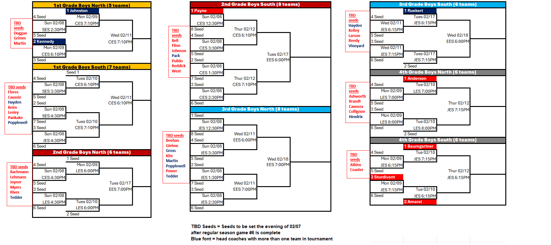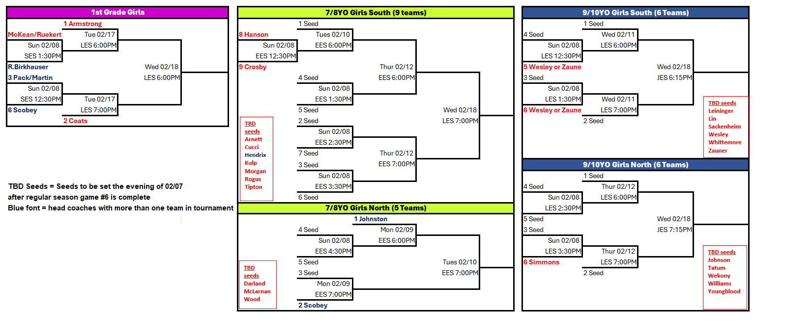 We have 13 head coaches that have two teams in the tournament. To avoid schedule conflicts, the brackets as they exist today may change (i.e. the matchup at 1:30 is swapped with 3:30). This does not apply for the brackets and seeds already set for 1st Grade Girls, 5th Grade Boys, 11/12YO Boys North and 13/14YO Boys.