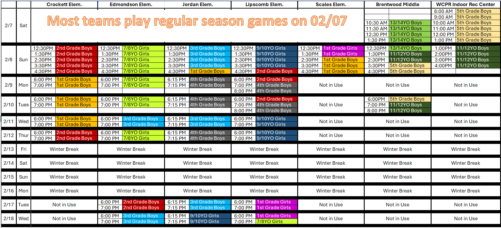 Game day is Saturday. All 134 Brentwood teams are playing. Games last most of the scheduled period so no need to arrive early. Maybe 10-15 minutes before your scheduled start.